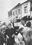 | Sammelplatz an der Kreuzfeldschule | Die Ensheimer werden auf LKWs verladen |