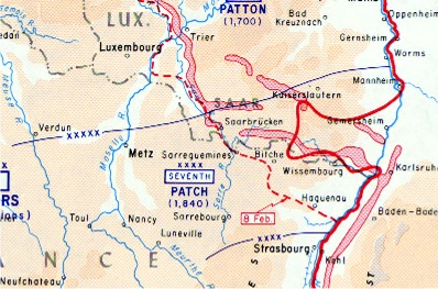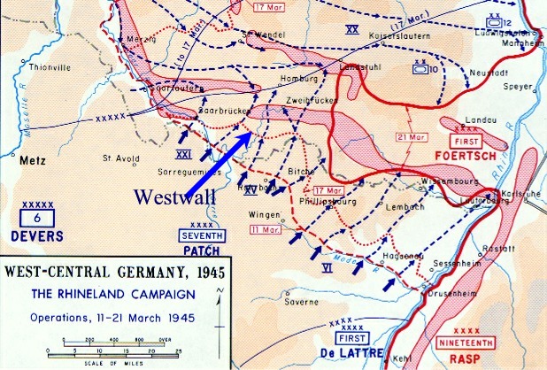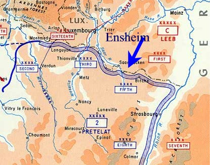 2) In zwei US-Berichten über die damaligen Ereignisse liest sich diese Geschichte aber doch etwas anders. Demnach wurde Ensheim zunächst von deutschen Truppen hartnäckig verteidigt, musste aber wenig später aufgrund der "heldenhaften Taten des III. Bataillons" aufgegeben werden. Möglicherweise wurde Ensheim in der Tat schnell erobert, aber die Kämpfe um den Durchbruch des etwa 2 km nördlich von Ensheim vorbeiführenden Westwalls wurden noch bis zum 20. März 1945 mit erbitterter Härte geführt, was über 70 deutschen Soldaten das Leben kostete. Wie viele alliierte Opfer es gab, ist nicht überliefert.