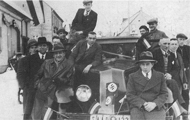 Ensheimer Nazi-Sympathisanten stellen sich am Tag der Saarabstimmung (13.01.1935) zum Gruppenbild um einen mit Hakenkreuzfähnchen geschmückten PKW