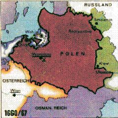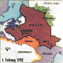 In der zweiten Hälfte des 18. Jahrhundert geriet das Königreich Polen immer mehr unter den Einfluß der russischen Zaren. 1764 schloß Rußland mit Preußen ein Bündnis, um den von den Russen favorisierten Poniatowski auf den polnischen Thron zu hieven. Als es wegen dieser Einmischungspolitik fast zu einem russisch-österreichischen Krieg kam, wurde der Frieden auf Kosten Polens gerettet. Bei der 1. Polnischen Teilung 1772 machen alle drei Großmächte Gebietsgewinne und können dadurch ihr eigenes Territorium "abrunden".
