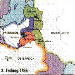 Als sich die Polen diese russische Bevormundung nicht mehr gefallen ließen und 1794 einen Volksaufstand unter ihrem späteren Nationalhelden Kosciuszko versuchten, schlugen russische und preußische Truppen brutal zurück. Damit war Polens Schicksal besiegelt und das Ende als Staat gekommen: Mit der 3. Polnischen Teilung verschwand Polen 1795 von der europäischen Landkarte - für über 120 Jahre !